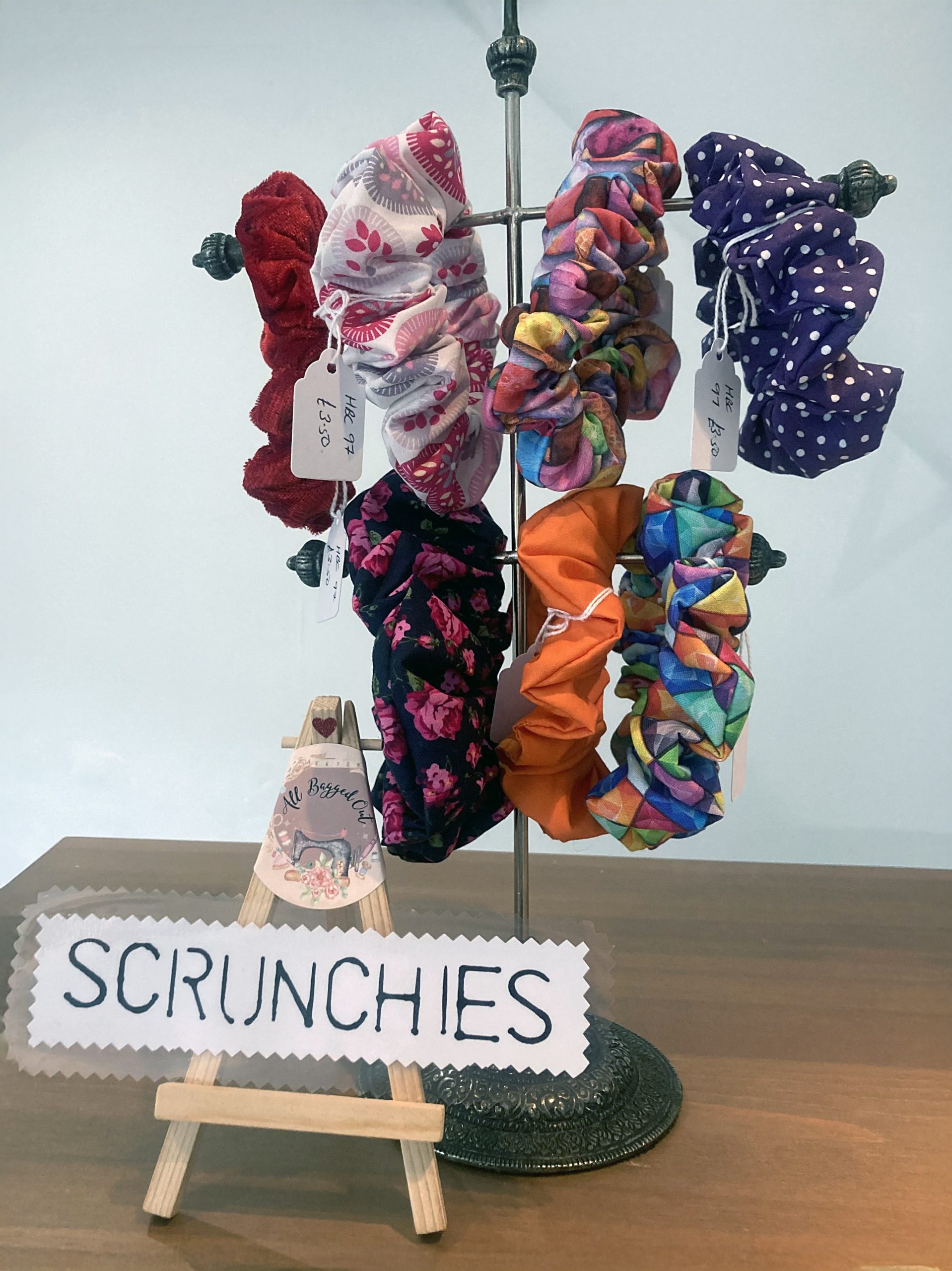 Soft, fabric-covered elastic bands used to tie back hair in a gentle & stylish way.